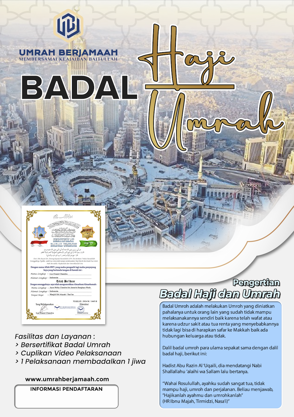 Program Badal Haji dan Umrah “Wahai Rasulullah, ayahku sudah sangat tua, tidak lagi mampu haji, umrah, dan perjalanan. Kemudian Beliau menjawab, ‘Hajikanlah ayahmu dan umrahkanlah’,” (HR. Ibnu Majah, Tirmidzi, Nasa’i). Chat Konsultasi dan Informasi Apa saja Syarat Badal Haji dan Umrah? Beragam Islam Diperuntukkan yang telah Udzur Maksud dari udzur disini adalah orang yang diwakilkan tidak mampu karena alasan fisik, seperti tua renta, atau dalam kondisi sakit sehingga tidak memungkinkan untuk melaksanakan Haji / umrah dan sulit diharapkan kesembuhannya. Diperuntukkan untuk orang yang telah meninggal Untuk satu rang dalam sekali ibadah Hanya boleh membadalkan untuk 1 orang tidak boleh lebih dalam sekali pelaksanaan badal Haji / umrah Tata Cara Pendaftaran Badal Haji / Umrah Tata cara pendaftaran badal Haji / Umrah sangat mudah sekali. Berikut adalah tata caranya Pendaftar menyerahkan FC KTP yang membadalkan Informasi nama lengkap yang akan dibadalkan Informasi Jenis kelamin Informasi nama lengkap ayah kandung Informasi dapat diisi melalu formulir Pendaftaran dibawah ini Membayar lunas biaya badal dengan transfer atau tunai di kantor UmrahBerjamaah Menentukan waktu pelaksanaan Setelah prosedur administrasi diatas selesai, maka UmrahBerjamaah akan menunaikan amanah badal Haji / Umrah melalui perwakilan pada waktu yang telah ditentukan/disepakati Yang melaksanakan ibadah badal Haji / Umrah adalah seorang ustad pembimbing perwakilan UmrahBerjamaah yang bermukim di Mekah. Selama pelaksanaan akan didokumentasikan berupa cuplikan video yang nantinya, file video tersebut menjadi hak milik pendaftar. File video akan dikirim melalui email ataupun whatsapp Formulir Pendaftaran
