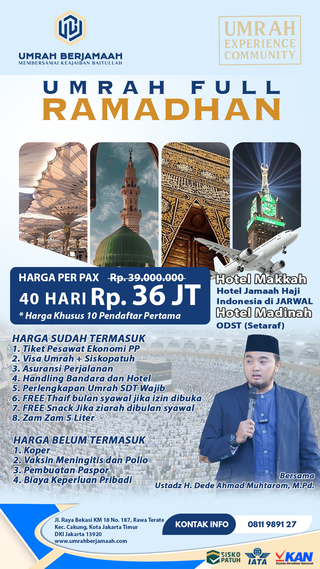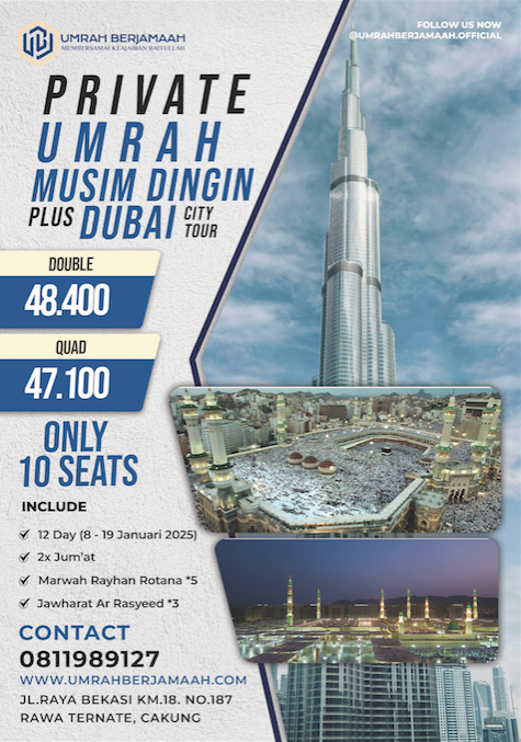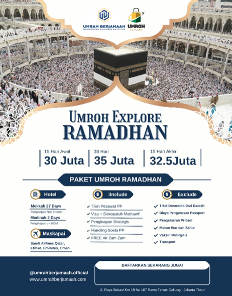 Paket Umrah Explore Ramadhan 2025 Paket Umrah Explore Ramadhan 2025 Jakarta Jeddah Usia Min : 0+ 2 Maret – 5 April 2024 Jamaah : 21 Seat Makkah : Apartement Madinah : Apartement DAFTAR UMRAH Bismillah.Assalamualaikum wr wb Yakin Gak Mau Nyobain Tinggal 1 Bulan +++ Di Mekkah dan Madinah..??? Berapa Sih Budgetnya…??? Yakin Dech Umrah Berjamaah Bareng Mabda Tour Program @UmrahExplore Paling Murah Cuman 30jt Saja dan Terbatas untuk Batch 1 ️ [ Full Booked ]35jt untuk Batch 2 [ Availabale ] Include Apa Saja..??? Detail 1. Tiket PP Jakarta-Jeddah (Garuda/Saudi Airline/etihad/Qatar)2. Visa Umrah 3. Penginapan 1 Bulan (Apartemen Mekkah & Madinah)4. Siskopatuh Bagi yang Bener-bener Mau Ikutan .. Buruan Booking dari Sekarang 5jt Selagi Harganya masih terjangkau.. Bisa dicicil sampai H-60 keberangkatan Loh.. Pelunasan 2 Bulan Sebelum Keberangkatan ️Kenapa Harus Ikut..???️Pengalaman Berkesan dan Bisa Leluasa Membuat Jadwal Kegiatan Di Tanah Suci️Bisa Umrah Berkali-kali️Bisa Berlama-lama itikaf di Masjid Tidak Dikejar Waktu Singkat️Banyak Destinasi dan Pengalaman Baru Dibandingkan Umrah Reguler️Izin Umrah Lengkap Segera Booking 5jt PT. UBJ Mulkan Mulia Mohon Konfirmasi Setelah Transferwa.me/62811989127 Jamaah Umrah Galeri DAFTAR SEKARANG UMRAH EXPLORE 1447 H / 2026 M Atau DAFTAR NABUNG