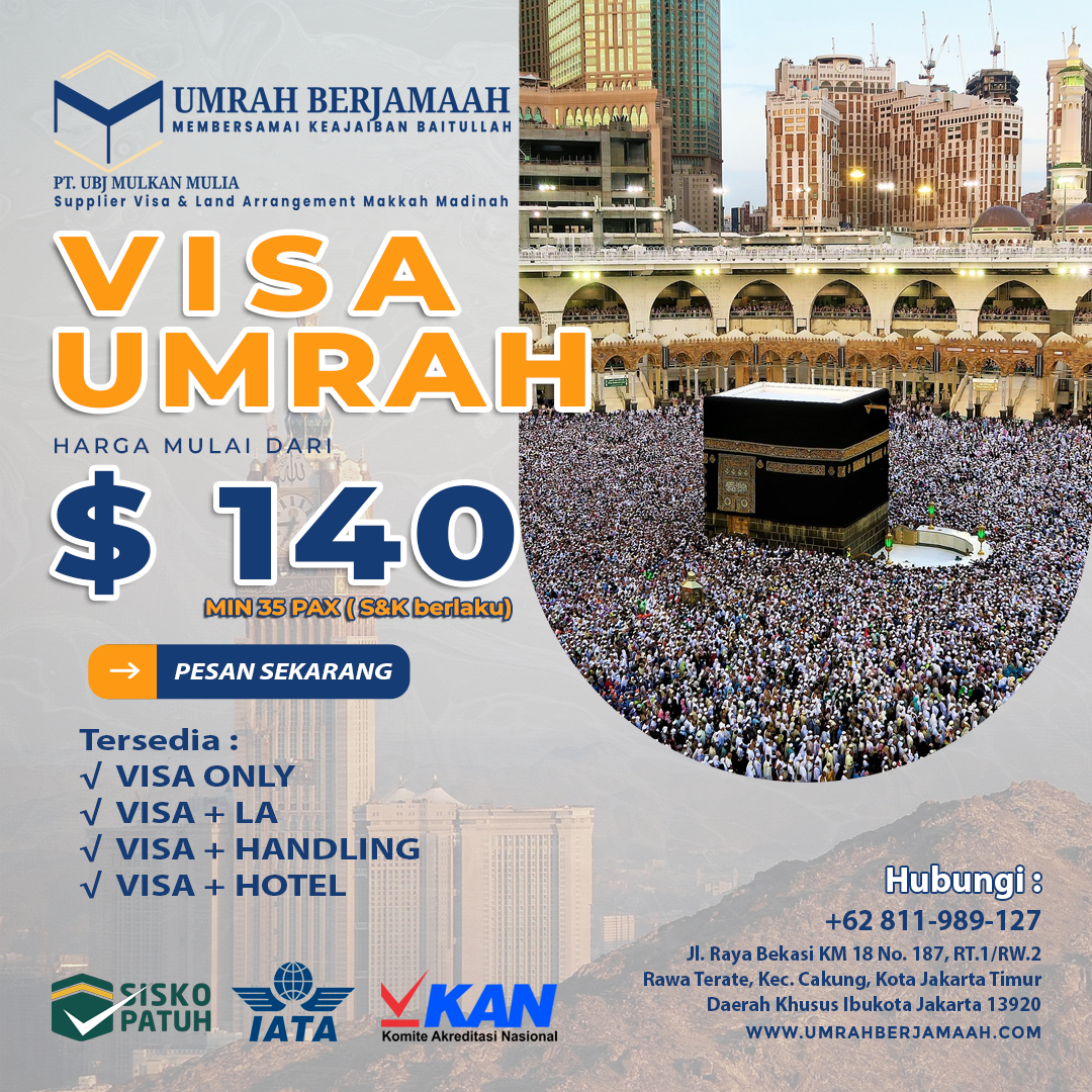 Harga Visa Umrah mulai dari $140 Proses Cepat – Visa Umrah PT. UBJ Mulkan Mulia. Masa berlaku Visa umrah selama 90 hari, dan dapat digunakan untuk mengunjungi seluruh wilayah di Arab Saudi.